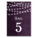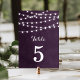 Design de cartão de número da mesa de casamento moderna de verão com simples luzes de cordas brilhantes e elegantes penduradas no topo e uma mistura elegante de fontes modernas e caligráficas em um fundo de textura falsa. Um design de pré-disquete simples e na moda, perfeito para o verão! Clique no botão PERSONALIZAR TI para personalizar fontes, mover texto e criar seu próprio design de convite exclusivo.