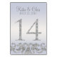 Esta design de mesa moderna de placa de apresenta sotaques falso de brilho prateado com fundo periwinkle. Perfeito para casamentos elegantes e modernos. As placas de números da tabela chegam a 30.