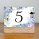Personalize esses Números de Tabela de Cor de Água das Flores de Hydrangea Azul bonito para cada mesa no tema de inspiração do jardim de verão chá de panela, festa de aniversário ou recepção de casamentos. Estes cartões de número de mesa flutuante personalizados e elegantes apresentam uma coloração aquosa digital pintada por uma fotografia floral de uma flor azul clara de hydrangea com um fundo branco.