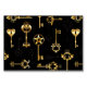 Padrão perfeito de chaves antigas, douradas e silhuetas em fundo preto.
