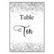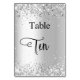 O número da mesa é escrito com um estilo de letra elegante e personalizado. Letras pretas, fundo branco na frente e fundo prateado falso com pó de brilho falso, brilhos no verso.