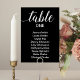 Direcione aos seus convidados para a mesa adequada com estes cartões elegantes de assentos com script branco e fontes de bloqueio em um plano de fundo preto. Personalize o número da tabela e o nome do convidado. Parte da coleção Alejandra.
