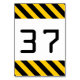 Esta placa de mesa apresenta faixas/linhas pretas e amarelas, com o número da tabela em uma área central branca.