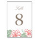 As placas de número de tabela chic em tons de coral vibrante, verde macio e esticado apresentam o número de sua mesa com uma borda inferior de flores de hibisco tropicais. Design repete-se no lado oposto. Coordena-se com a nossa suíte de convites de casamento de Hibiscus na Ilha para assuntos de praia ou casamentos de destino.