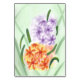 Uma bonito pintura aquosa de flores de hyacinth é fotografada na frente desses cartões. O texto no verso diz: "flores de hyacinth As flores de Hyacinth crescem em um aglomerado no topo do caule. Os Hyacintos florescem na primavera. Os Hyacintos são perenes, o que significa que voltam ano após ano." O texto pode ser personalizado com suas palavras. Estas são uma escolha excelente para estudantes de alfabetização adulta. Obrigado por comprar a CustomFlashCards no Zazzle.
