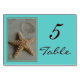 Esta carta de números de mesas de casamento do tema da praia do excelente mostra uma fotografia de um peixe-estrela na areia como ponto focal com o seu número de tabela personalizado à direita da fotografia. Este é um cartão de excelente para um casamento temático na praia. Direitos autorais