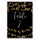 Preto e Branco romântico e elegante com Número de Tabela de Casamento de Folhas Douradas desenhado com folhas de cor amarelo macio e texto branco sobre fundo preto. O texto inclui: Mesa e número. Para personalizar, basta inserir um número por cartão solicitado. A amostra mostra o número 7. Observe que o número será repetido automaticamente no sentido inverso. Verifique frente e verso antes de solicitar cada cartão.