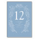 Primavera de fleur de lis desenhado à mão com um elegante número de casamento enquadrado com primavera, folhas, guloseimas e pequenas borboletas. Em azul clássico empoeirado com letras brancas e desenho, personalize com seus próprios nomes, iniciais monogramas e números de tabela. Cada número necessário deve ser adicionado ao carrinho, um de cada vez. Outras cores e itens correspondentes estão disponíveis ou podem ser criados por solicitação. © Desenho manual original e design por Sarah Trett para www.mylittleedenweddings.com no Zazzle.