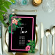 Uma moderna, mas retrorada, botânica tropical rosa-néon em fundo negro. Um belo design de casamento ideal para o verão. Design de plantas tropicais, cor-de-rosa, néon perfeito, com palmeiras, flores de Hibiscus cor-de-rosa e flores de Plumerias Frangipanis. As cores pretas, cor-de-rosa e verde dominam este design de neon rosa tropical. A tipografia da caligrafia moderna contrasta perfeitamente com o tema design do casamento preto e rosa. Uma design elegante da mesa de casamento com elementos simples modernos. Também estão disponíveis itens de papelaria de casamento e outros formatos de convite de casamento. Personalize o número e adquira cada número mesa individualmente de acordo com quantos números de tabela você precisa.