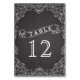 Quadro de folha de rolagem Vintage e número da mesa de casamento do quadro de calçados, cartão de lugar com um quadro branco de rolagem das folhas de rolagem em um quadro de cinza de carvão ou fundo de quadro negro e seu texto em uma faixa. Uma abordagem moderna e contemporânea a um tema antigo. Este modelo é parte de um casamento, é totalmente personalizável e pode ser personalizado.
