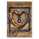 Cartão de mesa de casamento rústico country em madeira de celeiro com forma de coração, quadro de galho de madeira para os cartões de número de mesa e roda de carroça com ferradura de cavalo prateada.