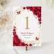 Cartões de números para celebrações da Quinceanera vermelha, dourada e branca. Recursos, fontes de script, borboletas douradas, rosas de aquarela e tiara. Perfeito para uma elegante celebração de glam estilo princesa. Personalize com seus próprios detalhes. Impressos convites Zazzle ou modelo de impressão digital instantânea para download.