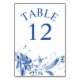 Este charmoso cartão de número de mesa para um casamento é adorado com um design floral azul e branco espantoso, criando uma atmosfera glacial e etérea - perfeita para um evento memorável.
