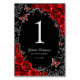 Red black silver Quinceanera celebration table number cards. Features, script font, glitter silver butterflies, watercolor roses and tiara. Perfect for an elegant princess style glam celebration. Personalize with your own details. Printed Zazzle invitations or instant download digital printable template.