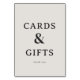 This elegant tabletop sign features a minimalist design with the phrase "CARDS & GIFTS" prominently displayed in bold, classic typography. The understated color palette of soft beige and black creates a sophisticated and timeless look perfect for wedding receptions or other formal events. The simple yet refined style conveys gratitude and appreciation, making it an ideal addition to your special day's decor. Its clean lines and subtle charm ensure it complements any table setting while adding a touch of class.