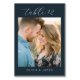 This wedding table card features a romantic and intimate design with a rectangular layout divided into two sections. The top section has a deep navy background with elegant cursive text for the table number, while the bottom section showcases a soft-focus photograph of a couple, framed by the same navy border. Below the photo, customizable names are displayed in clean, sans-serif font. The warm tones from the photograph contrast beautifully with the cool navy backdrop, creating a sophisticated yet inviting atmosphere perfect for celebrating love at your special event.