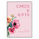 Este sinal de mesa de casamento apresenta um fundo rosa suave adornado com um arranjo floral em aquarela em tons de pêssego, coral e azul claro. O design inclui tipografia elegante com "CARDS & GIFTS" exibido de forma proeminente na parte superior em fonte serifada em negrito, enquanto "obrigado" é escrito em um estilo mais claro e itálico abaixo. A estética geral é romântica e delicada, perfeita para expressar gratidão em seu evento especial. A composição equilibrada e a paleta de cores harmoniosa criam uma atmosfera quente e convidativa, tornando-a uma adição ideal a qualquer celebração de casamento.