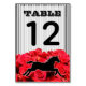 As placas de números de tabela do chá de panela estilo Derby apresentam rosas vermelhas e um cavalo de corrida em um fundo de faixa branca e preta. *DICA: ALTERE O NÚMERO DA TABELA, coloque no carrinho de compro para cada número que você deseja solicitar. CORRESPONDENTE a itens na nossa coleção.