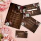 Um arranjo floral botânico elegante com um cartão de mesa de fundo de madeira rústica. Este cartão de mesa é perfeito para uma noiva que quer uma sensação rústica para o seu casamento com um toque de elegância.