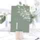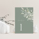 Sage green botanical wedding table number card designed for elegant reception tables.