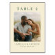 This wedding table card features a serene and elegant design with a centered photo of two individuals sitting closely in an outdoor setting, surrounded by tall grasses. The layout is balanced and symmetrical, set against a soft pale yellow background with dark green text that includes the table number and customizable names and date. The rustic yet sophisticated theme is enhanced by classic serif fonts and a natural color palette, creating a warm and intimate mood perfect for a memorable celebration.