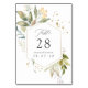 Cartões de número de mesa de casamento com vegetação floral em aquarela em tons pastéis com moldura geométrica dourada personalizável para os detalhes do seu evento.