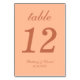 Um simples número da mesa de casamento para um esquema de cor de pêssego e terracota. É apenas texto marrom de terracota sobre fundo de pêssego. Tudo, exceto o número em si, é escrito em um roteiro caligráfico elegante.