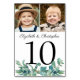 Sinais elegantes de número da mesa de casamento personalizados com duas fotos, nomes da noiva e noiva e acentuados com folhas de cor d'água eucalipto. Incluir várias fotos do casal ao longo dos anos ou suas fotos de noivado para uma placa de mesa divertida para convidados de casamento. É divertido ter fotos da mesma idade no mesmo sinal e fotos diferentes em cada mesa que os hóspedes se misturam. Impresso em ambos os lados para visualização dupla. A cor do texto preto pode ser alterada para coordenar com as cores do seu casamento. DICA FOTO: Escolha fotos com o assunto no meio e/ou pré-recorte em formas quadradas ANTES de carregar e/ou usar a ferramenta CROP para ajustar a imagem dentro da área do modelo. ASSISTÊNCIA: Para obter ajuda sobre modificação ou personalização do design, alteração de cor, redimensionamento, transferência do design para outro produto ou sobre como coordenar itens, entre em contato com o designer ANTES DE PEDIR por meio do Zazzle Chat ou makeitaboutyoustore@gmail.com.