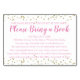 Chá de fraldas de cartão de livro bonito - por favor, traga um cartão de inserção de livro com faux gold confetti e pink font. Adicione um cartão a cada convite que você enviar para os hóspedes para trazer um livro para o bebê para começar uma biblioteca. Editar frente e trás