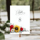 Sunflower and rose wedding floral table number.