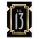 Esta elegante carta da Mesa Núm. treze está no estilo vintage dezenove anos Art Deco. O design gráfico em negrito é apresentado em preto clássico e branco com sotaques dourados sutilmente sombreados. Uma letra de aparência falsa em losango forma numeral em um ponto correto formando o ponto focal deste cartão.