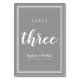 Esta design foi criada para comemorações íntimas de casamento. A design da Tabela de Casamento Simples, Mínima e elegante Três apresenta um design contemporâneo com uma dupla borda de quadros em branco nítido em um fundo de Cinza Ultimate. O design é chic e eterno. Personalize a design de mesa de casamento com seus detalhes de casamento em letras brancas nítidas e roteiro. A parte traseira da placa é uma duplicata da parte frontal. Encomenda um para cada mesa com os números de tabela individuais. O Mesa ONE to TEN foi projetado individualmente e está disponível em nossa loja InvitationSuites no Zazzle. Embora tenha criado especificamente a um local menor, se precisar de números adicionais, envie-nos um e-mail para InvitationSuites@gmail.com.