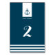Um moderno Número da Tabela de Casamento em um tema Náutico, com ilustração de âncora e listras brancas em fundo de marinho.