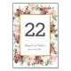 Belo e elegante cartão de número de mesa para um casamento; projetado para o casal romântico que ama elegância tradicional com delicados toques de ouro. Os tradicionais florais de aquarelas rodeiam uma fina estrutura de ouro que anestala a tipografia do sinal. O design floral apresenta lindas flores mauve e delicadas rosas brancas e cor-de-rosa e suaves, aliadas a belos verdes. Pequenas substâncias botânicas brancas e verdes enchem a design.