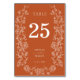 Número Da Mesa De Casamento Floral De Terracotta. Esta placa de número de tabela tem um estilo suave e elegante com uma estrutura floral branca que parece eterno. As ilustrações florais brancas deliciosas ao longo dos lados adicionam um toque de charme brilhante e inspirado na natureza. O layout é limpo e organizado, usando um alinhamento centralizado e espaçamento nítido para criar uma aparência refinada. Perfeito para um tema de outono. No geral, a design sente-se romântica, mas subestimada, perfeita para um casamento moderno ou tradicional.