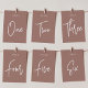 Cartões simples e chicos de números de mesas na Terra Terracotta e Branco fazem uma declaração elegante no seu casamento ou evento. Design apresenta "mesa [number]" em uma combinação de olhares de serif clássica e de caracteres de script manuscritos. Design repete-se de ambos os lados. Cartões numerados individualmente vendidos separadamente; solicite cada número de tabela individualmente da nossa coleção.