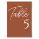 Números modernos da mesa elevam a decoração da mesa da recepção de casamento. O design apresenta uma fonte elegante em branco sobre um fundo de tons laranja queimados perfeito para um evento de casamento outono ou banquete. Solicite cada número de tabela da coleção ou edite este cartão para cada número necessário. O design é impresso em ambos os lados.