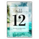 Make it easy for your guests to find their tables with these lovely table number cards. The elegant coastal or island themed design features fancy script calligraphy on a watercolor background of a tropical beach with palm trees and turquoise waters. The names of the couple and wedding date appear at the bottom. Please Note: Each card must be customized individually.