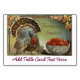 Vintage image de um peru ao lado de uma tigela de maçãs vermelhas e das palavras "Saudações de Ação de Graças". O esquema de cores apresenta tons de terra quente. Esta design é baseada numa imagem dominio público da coleção Nancy Oram.