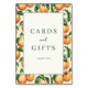 This wedding tabletop sign features a charming design with a central white square framed by a grid of peach illustrations, rendered in warm orange and green tones. The elegant serif typography reads "Cards and Gifts" with a heartfelt "Thank You" below, creating a classic and inviting look perfect for expressing gratitude at your event. The realistic yet artistic depiction of peaches adds a touch of natural beauty, while the harmonious color palette evokes warmth and appreciation, making it an ideal addition to any celebration.