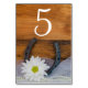 Adicione um toque de charme à decoração da sua fazenda rural ou chá de panela do estilo rancho ou recepção de casamentos com a margarida branca casual, mas clássica, e os Números de Tabelas de Casamento Ocidental do País de Ferradura. Estes cartões temáticos de números de mesas de equinos, personalizados e rústicos, apresentam uma fina fotografia floral de uma galinha branca, ferradura empoeirada, colar pérola e véu branco de brasa com um fundo de madeira de celeiro de castanho.