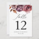 Elegante, outono, cartões florais de números das mesas de casamento com uma fronteira superior de flores aquáticas e folhagem em tons de marsala, burgundy, roxo, castanho e laranja complementados por um moderno roteiro de caligrafia. Para solicitar os cartões de mesa: adicione seu nome, data do casamento e número da tabela. Adicione cada número ao carrinho individualmente e faça check-out quando terminar. Projetado para coordenar com a nossa coleção de casamento Rustic Autumn Floral.