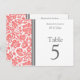 Pêssego elegante e moderno cor-de-rosa-laranja, cinzas e cartões de números de mesas de casamento brancos com padrão de vinheta floral clássico e chic. Personalize estes cartões para criar cartões de número de tabela personalizados para cada mesa no seu casamento. Adicione seus nomes e data de casamento. Padrão disponível em uma grande variedade de produtos de casamento correspondentes.