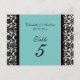 Cartões de números de mesas de casamento, preto e branco, elegantes e clássicos, azul-turquesa, com cor damasco floral clássica. Personalize estes cartões para criar cartões de número de tabela personalizados para cada mesa no seu casamento. Adicione seus nomes e data de casamento. Padrão disponível em uma grande variedade de produtos de casamento correspondentes.