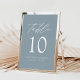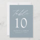 Trendy, cartões minimalistas de números das mesas de casamento com letras brancas com "Mesa" em um roteiro de caligrafia moderno. O design apresenta um fundo azul empoeirado ou uma cor de sua escolha. O design repete atrás. Para solicitar os cartões de mesa: adicione seu nome, data do casamento e número da tabela. Adicione cada número ao carrinho individualmente e faça check-out quando terminar.
