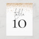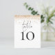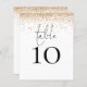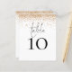 Um tamanho de 4,5 x 5,6 pol de semirbrilho com peso de 110 lb, que é de espessura semelhante a um cartão postal, com UM por folha. Número da Tabela de Casamento de Script de Falha Dourada. Um design elegante com mesa em um script de estilo de escrita manual definido e seu número de tabela abaixo. Personalize facilmente o número. Uma borda cintilante de falso prateado corre ao longo da borda superior. O mesmo design está do outro lado.