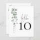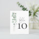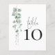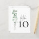 Um tamanho de 4,5 x 5,6 pol de semirbrilho com peso de 110 lb, que é de espessura semelhante a um cartão postal, com UM por folha. Número da Tabela de Casamento do Script Eucalyptus. A mesa é definida em um script de estilo de escrita manual e seu número de tabela abaixo com uma folhagem elegante de aquarela no lado esquerdo. Personalize facilmente o número. O mesmo design está do outro lado e será atualizado simultaneamente à medida que você fizer a alteração no número.