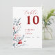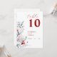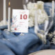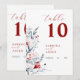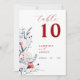 A placa de número da mesa de casamento apresenta um número proeminente "10" em uma letra vermelha elegante no centro. O lado esquerdo do cartão é adornado com um belo design floral em tons azuis, vermelhos e cinzas, complementados por folhagem verde. O fundo branco aprimora as cores vibrantes, fazer esta placa numérica da tabela a d na moda e opções sofisticadas para recepções de casamento. Ideal para casais que buscam decoração elegante e memorável de mesa para seu dia especial.