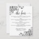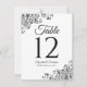Simples números de mesas de casamento preto e branco com cantos decorativos e um menu de bar ou bebidas no verso