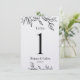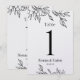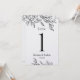 Um número de mesa floral de arte de linhagem branca minimalista, que inclui uma representação de um rosa, botões e folhas desenhados à mão num cartão de martelo pérola.
